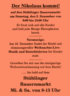 …auf den Stühlinger Bauernmarkt am Samstag, den 4. Dezember von 9:00 bis 13:00 Uhr. Er freut sich auf alle Kinder und hält jede Menge Kleinigkeiten bereit.