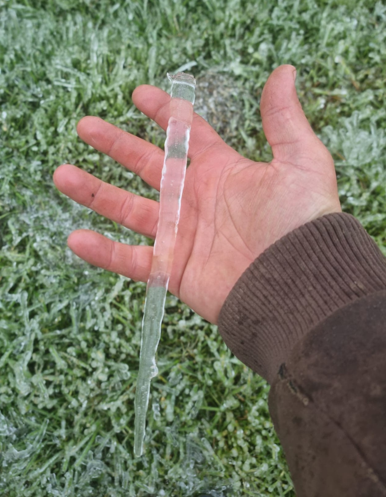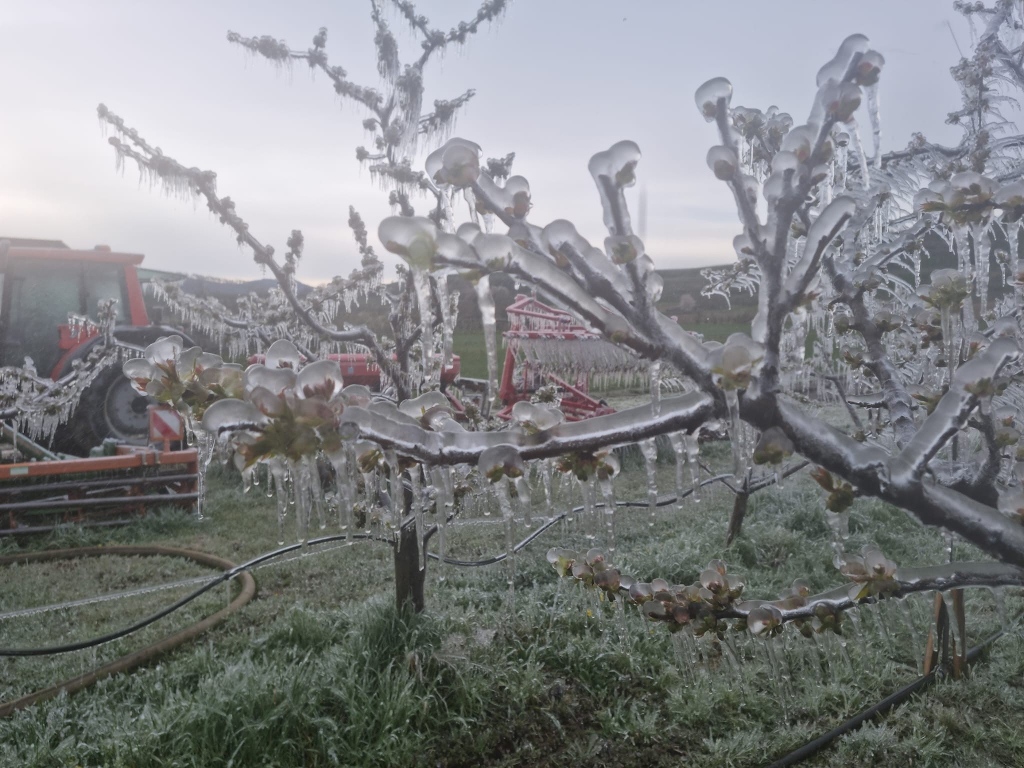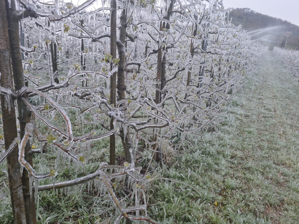Um die Bäume zu schützen, setzen wir manchmal Frostschutzberegnung ein. Dabei wird die Anlage eingeschaltet, bevor es zu kalt wird. Das Wasser gefriert auf den Blüten und gibt dabei Wärme ab – ausreichend, damit sie nicht erfrieren.